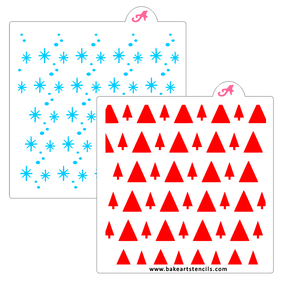Our Modern Winter Pattern Cookie Stencil Set is made up of two coordinating templates. One stencil features the triangle shaped trees and the other has the snowflakes and ornaments. This pattern is perfect for decorating Christmas cookies and seasonal sweets!