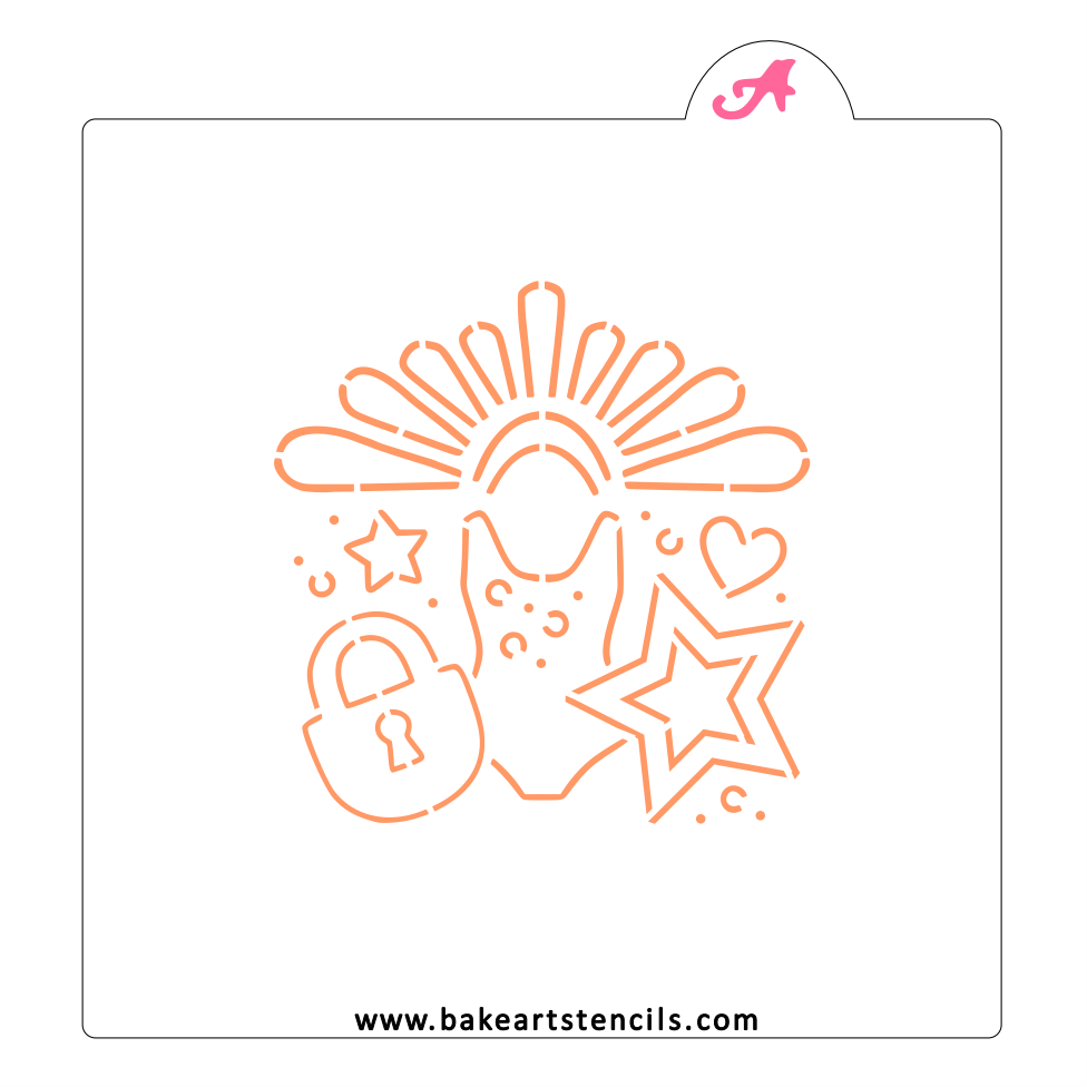 Our Showgirl PYO Cookie Stencil, a party design, features a marquee sign with a costume, stars and lock.